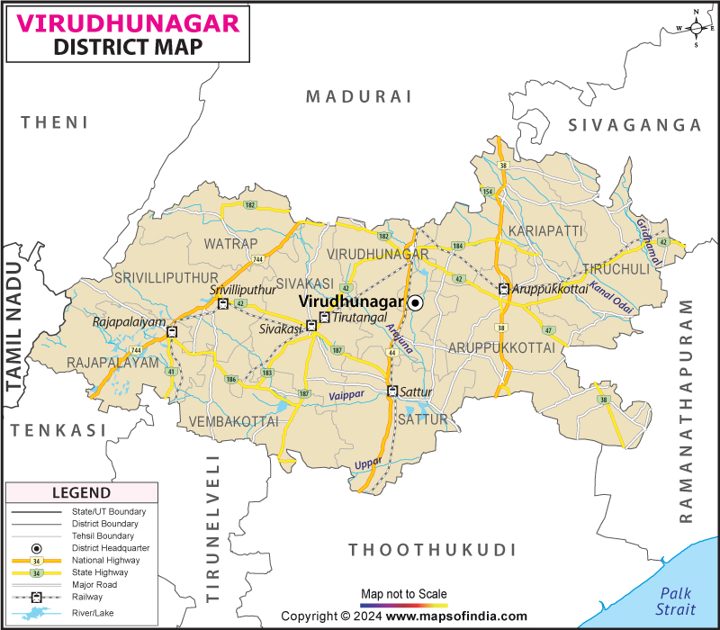 The Virudhunagar District is located between 11°00’ and 12°00’ north latitudes and 77°28’ and 78°50’ east longitudes. It has an area of about 4243 square kilometers. It is bound on the East by the Western Ghats, on the North by Madurai district, on the North–East by Sivagangai district, on the East and the South-East by Ramanathapuram district and on the South by Thoothukkudi District. The location map of the Virudhunagar district is shown in Plate No 1.